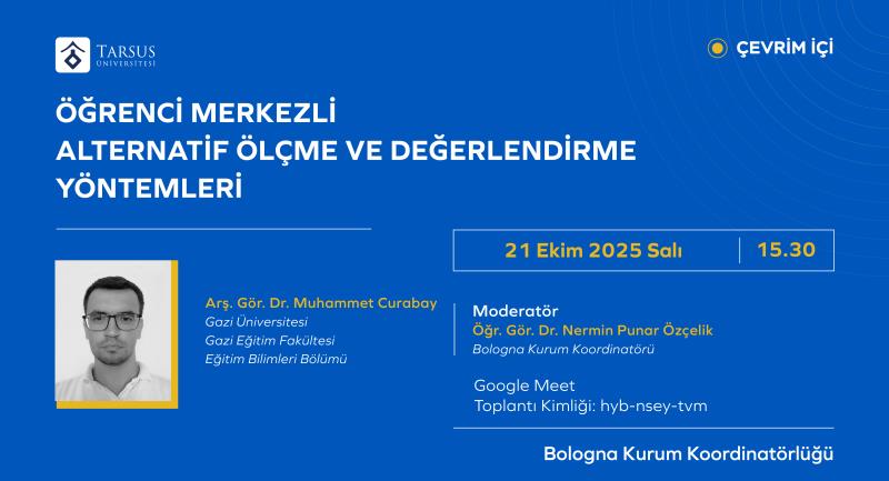 Tarsus Üniversitesi Bologna Kurum Koordinatörlüğü Eğiticilerin Eğitimi kapsamında, Gazi Üniversitesi, Gazi Eğitim Fakültesi, Eğitim Bilimleri Bölümü, Eğitimde Ölçme ve Değerlendirme Ana Bilim Dalı öğretim elemanlarından Arş. Gör. Dr. Muhammet CURABAY tarafından 21 Ekim 2025 tarihinde 15.30-16.30 saatleri arasında çevrimiçi Öğrenci Merkezli Alternatif Ölçme ve Değerlendirme Yöntemleri Eğitimi verilmiştir.